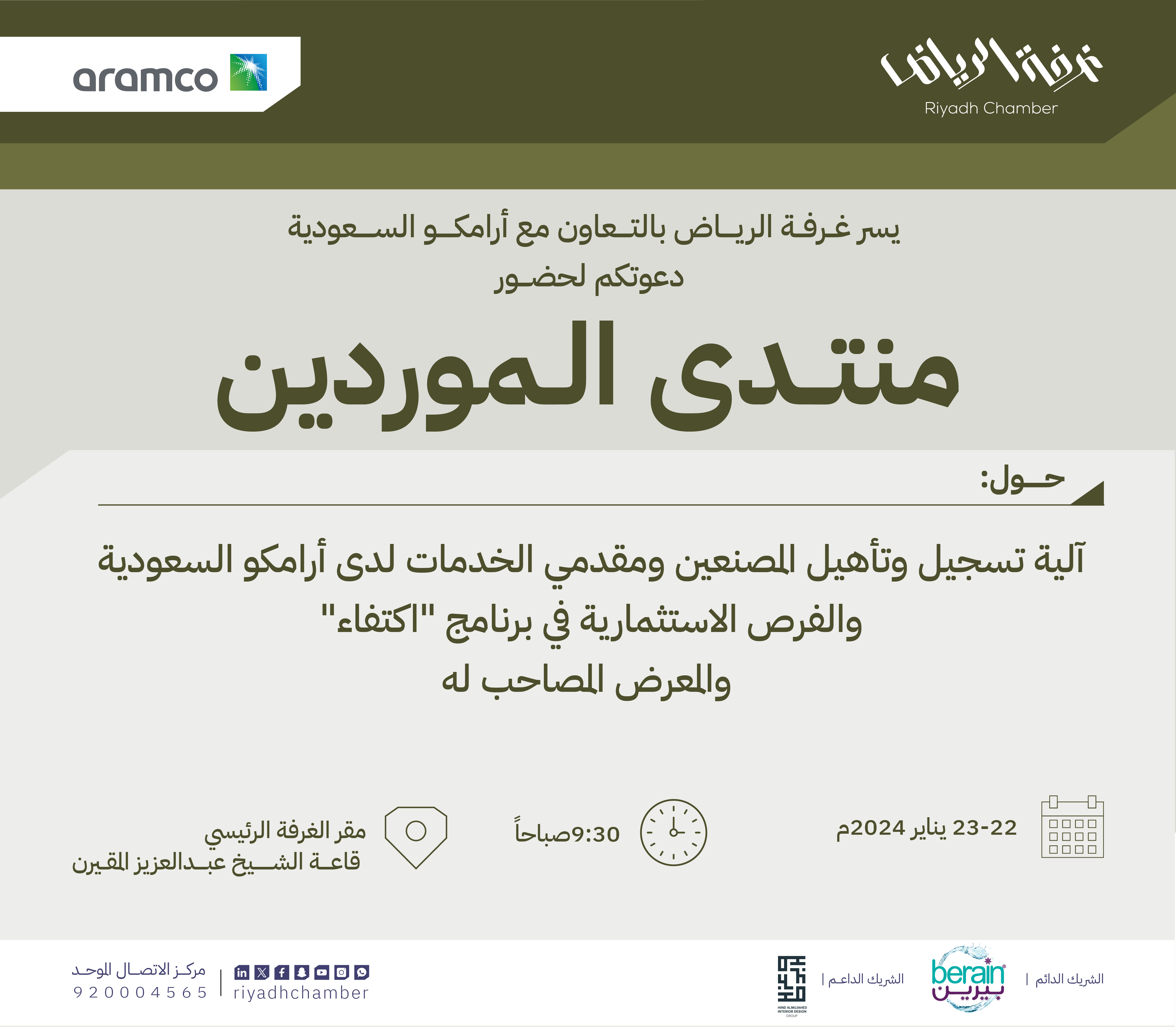 | الوصف | يسر غرفة الرياض بالتعاون مع أرامكو السعودية دعوتكم لحضور منتدى موردي أرامكو السعودية